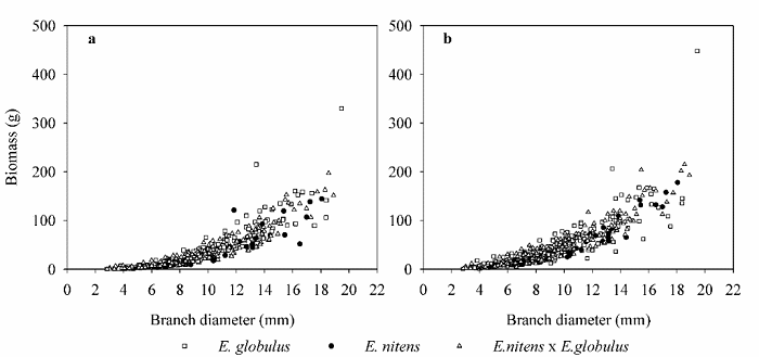 Biomass partitioning was similar among eucalyptus species. Individual stem biomass represented 50% of the total biomass, ranging between 31 - 68%, 38 - 60%, and 34 - 62%, for E. globulus, E. nitens, and E. nitens × E. globulus, respectively. Individual branch biomass represented 20% of total biomass and ranging between 12 - 27%, 14 - 28%, and 14 - 26% for E. globulus, E. nitens, and E. nitens × E. globulus, respectively. Individual leaf biomass represented 30% of the total biomass, and the largest variation among species ranged from 19 - 42%, 23 - 33%, and 22 - 39%, for E. globulus, E. nitens, and E. nitens × E. globulus, respectively. Leaf biomass represented approximately 50% of crown biomass.