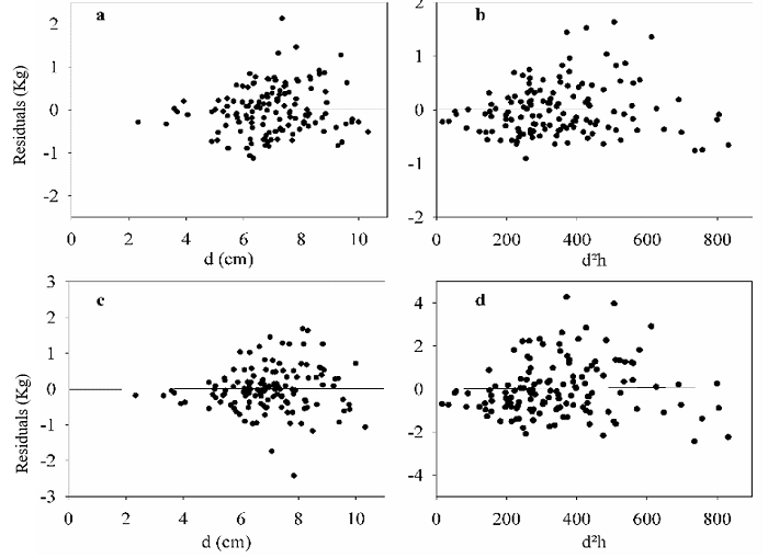 A pattern was detected in the increase of d and residual values, indicating that the residues fitted by SUR were not distributed in the same manner between tree sizes (Figure 2). As such, variability was present in the error model structure. To deal with this variation, the weight function was considered. The same behavior was observed when we compared GLS to WLS (data not shown). The weight functions used to correct the error variability used by WLS and WSUR are presented in Table 3 and show an improvement in the pattern of the residuals (Figure 3).