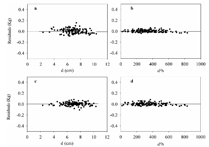 For the equations fitted by GLS, we observed that most equations underestimated individual biomass (Table 2). Branch and leaf biomass presented the lowest worst values of R²adj, the highest RMSE, and the highest CV because these variables presented the weakest correlations with d or h when compared to those of stem and total biomass.