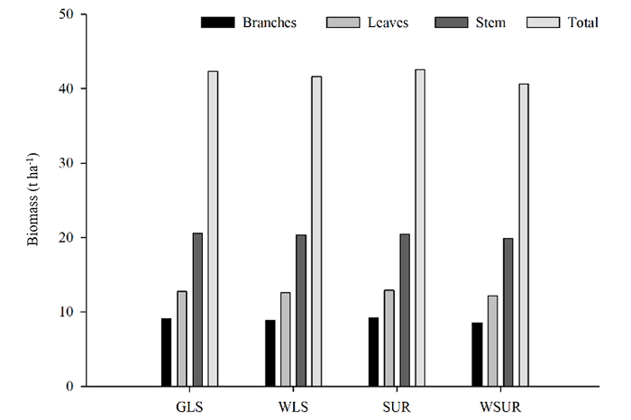 The biomass estimates at the hectare level obtained by the GLS, WLS, SUR, and WSUR methods not significantly different when compared with a Chi-square test (p > 0.05). The mean values that were estimated according to the aforementioned methods were similar among biomass components, indicating that there was no difference with regard to the performance of the estimations (Figure 4).