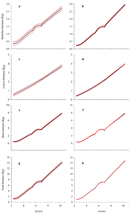 The efficiency of the estimators of the biomass equations fitted by all steps was assessed in relation to the precision of the calculated confidence intervals as follows (Parresol, 2001):