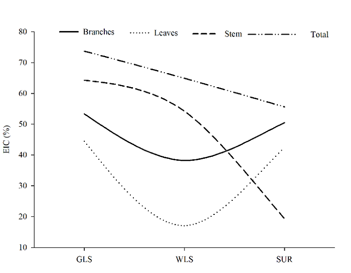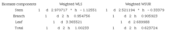 Estimator efficiency was not always related to biological consistency since WLS showed biological inconsistency; however, WLS presented greater efficiency estimators than that of SUR. Although the crown biomass components are difficult to model, it is necessary to use an estimator that results more accurate estimates, primarily because the leaves are raw material that ensure energy production and are important components for ecophysiological modeling (Binkley et al., 2004).