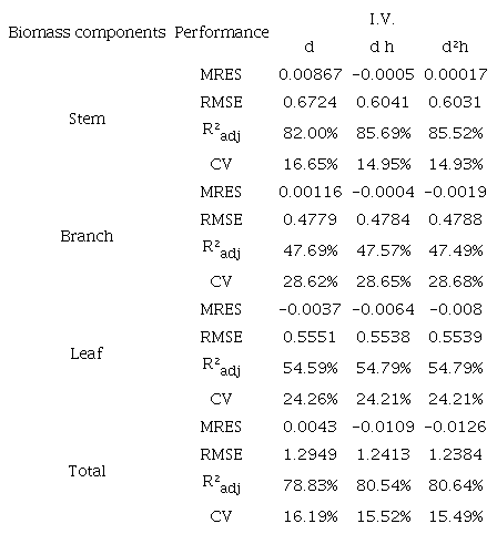 The estimated biomass component models were based on a nonlinear equation with additive error terms. These are the basic model forms that have been used in other forest stand studies (António et al., 2007). The independent variables in the models were d, dh, and d2h.