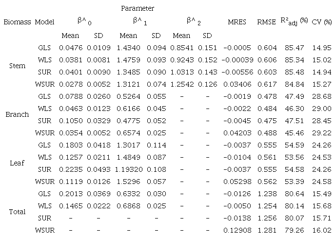 For WSUR, precision ranged from 0.02 - 9.12%, 1.53 - 11.43%, 0.11 - 13.06%, and 0.55 - 4.55% for stem, branch, leaf, and total biomass, respectively. The WUSR provided the most efficient estimators for all biomass components, resulting in a better model approaches when compared to those of GLS, WLS, and SUR. As shown in Figure 5, narrower confidence intervals were present with WSUR when compared to those of GLS, especially for branch and leaf biomass.
