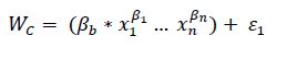 where: wc is the dry biomass component, c (stem, branches, leaves, or total) and ( are model coefficients, xn are the independent variables, and (t is the random error of the tth observation.