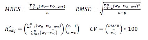 where; MRES is the mean residuals (Kg), RMSE is the root mean square error (Kg), R2adj is the fitted coefficient of determination (%), CV is the coefficient of variation (%), wc-est is the estimated dry biomass of component c, n is the number of data used in the fitting, p is the number of parameters in the model, and w-c is the mean value of the observed dependent variable for component c.