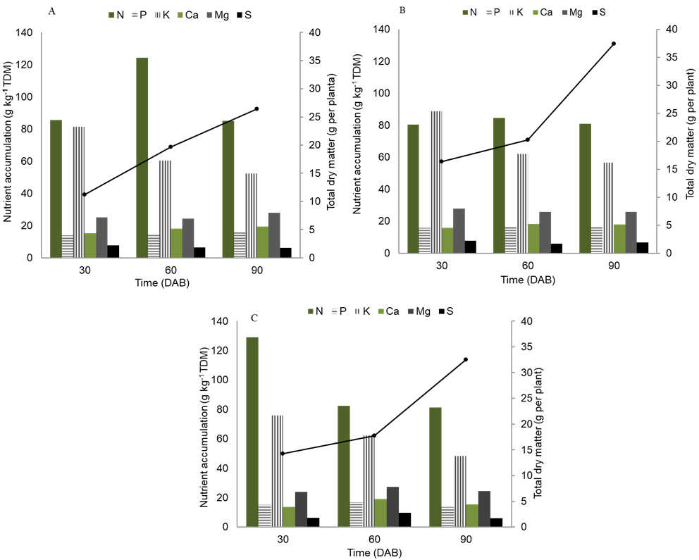 ‘Capdeboscq’ induced the greatest production of TDM in ‘BRS Rubimel’ plants, 90 DAB (Figure 1B), which was 30 and 12% higher than the dry matter accumulated during the same period by the ‘BRS Rubimel’/‘Flordaguard’ and ‘BRS Rubimel’/Okinawa Roxo combinations, respectively, with a peak phytomass accumulation between 60 and 90 DAB. Notably, this occurred even though ‘Capdeboscq’ was not superior in accumulating N, and maintained an almost equal amount of the other nutrients throughout the period of plant growth.