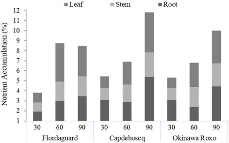 ‘Flordaguard’ induced a greater K accumulation in the leaves and stems than in the roots in the three evaluated periods (DAB) while ‘Okinawa Roxo’ induced a behavior similar to that of ‘Flordaguard’, except for the K content accumulated in the stems 90 DAB. ‘Capdeboscq’ induced a greater K accumulation in the roots 30 and 90 DAB, which is similar to what was observed with N accumulation by the same plants.