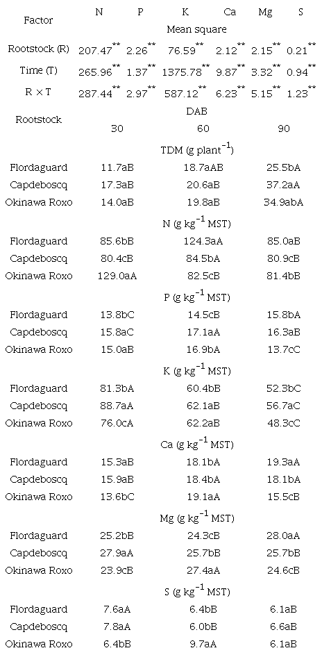 It is important to point out that for the three evaluated periods, ‘Capdeboscq’ had the lowest mean accumulation of N (i.e., 81.9 g kg-1 TDM). In contrast, ‘Flordaguard’ induced a greater accumulation of N, 60 and 90 DAB; and of Ca and Mg, 90 DAB compared to the other rootstocks that were tested, significantly lower values were obtained for the accumulation of P, K, and Mg, 60 DAB. However, in general, plants grafted onto ‘Flordaguard’ maintained an intermediate accumulation of macronutrients, with a tendency to greater accumulation during the more advanced periods, that is, 60 and 90 DAB, which may suggest a slower initial growth in the plants grafted onto this rootstock.