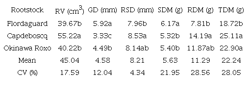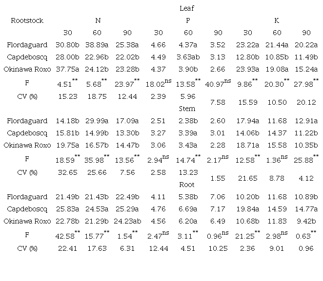 The considerable sink strength of the ‘Capdeboscq’ roots may be the consequence of a set of metabolic and transport processes related to genetic factors that dictate and boost the flow of assimilates to be used by the root system, irrespective of the growth period. This results in a higher proportion of dry matter in this organ as opposed to increases in the GCD and stem dry matter. According to Nawaz et al. (2016), molecular and physiological aspects that are inherent to the root system of the different rootstocks can limit or facilitate the absorption and translocation of mineral ions and, consequently, influence the final concentration of nutrients that is directed to the growth of the scion cultivar.