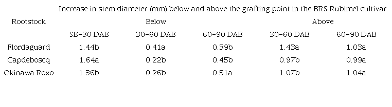 Significant differences in stem diameter below the grafting point were expected between the rootstocks in each period, since the rootstocks contain different genetic materials. However, it should be noted that in the period between the start of budding and 30 DAB, the recorded increase was considerably higher than that in the other periods, suggesting that the activity following grafting (i.e., toppling of the crown and tipping) results in a large part of the reserves accumulated in the roots being translocated to increase the diameter of the rootstock.