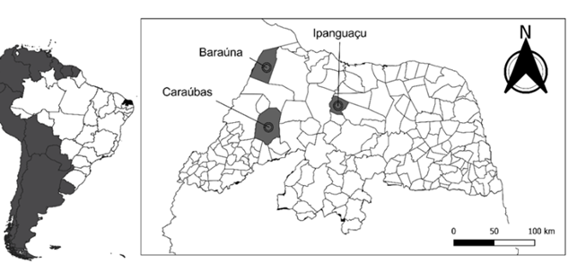 Leaf and root samples were collected from seven watermelon production fields in Rio Grande do Norte State, Brazil (Figure 1). The climate of the region is a hot semiarid according to the Köppen classification. Leaves were collected for use as a negative control. The samples were placed in plastic bags and transported to the laboratory for disinfestation (in 10% sodium hypochlorite solution for 1 min, followed by washing in distilled water for 2 min), then storage in a freezer at -20°C. Collections were carried out after the approval of the Genetic Heritage Management Council in the Brazilian National System of Management of Genetic Heritage and Associated Traditional Knowledge (SisGen), and materials were registered under the access code: AA2E8D4.