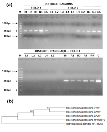 M. phaseolina was detected in three of the seven production fields where watermelon tissues were collected, two in Baraúna and one in Ipanguaçu. Profile of PCR products after amplification using the species-specific primers are shown in Figure 2a. Amplification of the stem tissues generated amplicons of 350 bp, which was expected according to the methodology described by (Babu et al., 2007). The same pattern was obtained with the control sample (MCBR5 isolate). However, no PCR products were obtained from leaf tissue samples.