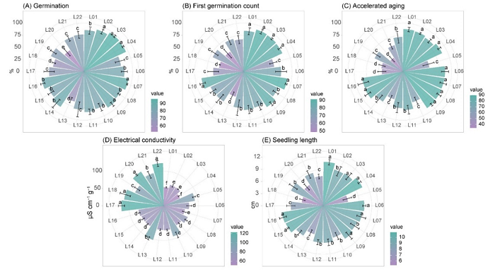 In this study, the physiological potential of the 22 soybean seed lots was evaluated using the germination test and four vigor tests. The seed lots showed differences in germination potential, which ranged from 53 to 96% (Figure 2A). The seed lots that did not differ in germination potential exhibited differences in vigor, based on the results of the first germination count (Figure 2B), accelerated aging (Figure 2C), seedling length (Figure 2D), and electrical conductivity (Figure 2E) tests. Thus, the 22 seed lots evaluated exhibited different levels of physiological potential.