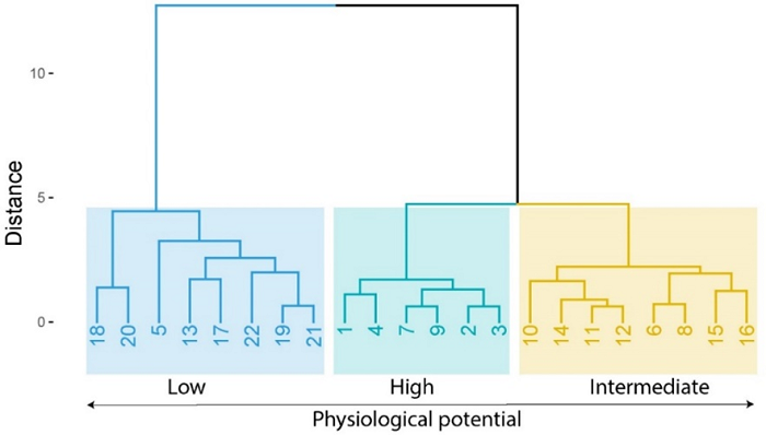 Descriptive analysis of all the data obtained was performed for each cluster. Subsequently, analysis of variance and Pearson correlation (p < 0.05) were performed on the data of physiological potential and those obtained through multispectral image analysis. Finally, the principal component analysis was performed using the variables showing significant differences between the clusters. Statistical analyses were performed using the R software (R Core Team, 2019).