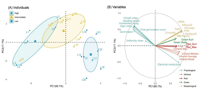 Multivariate principal component analysis was performed using the data obtained for the seed lots in the tests of physiological quality evaluation and from analysis of the multispectral images; i.e., only the variables that showed significant differences among the groups of seed quality were considered in this analysis (Table 1). The central ordering diagram (Figure 4A) shows the arrangement of the 22 individual seed lots, differentiated into their respective groups of physiological potential (high, intermediate, and low). The variables related to the physiological, multispectral, and morphological characteristics of the seeds are presented in the correlation circle (Figure 4B). Although the first two components explained 77% of the total variability of the data, there was a clear separation between the groups, with few points of intersection between the high and intermediate quality groups. Lots in the negative score of PC1 had lower values of germination, accelerated aging, vigor index, and seedling growth, showing, on the other hand, higher values of infrared, red, and green pixel values.