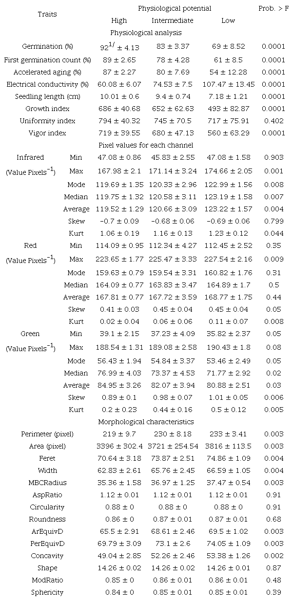 In the analysis of the multispectral images, significant (p < 0.01) differences were observed in most variables obtained from the infrared spectrum and in only a minor part of the red and green spectrum (Table 1). The parameters based on the pixel values, namely maximum, mode, median, and average of the multispectral images in the infrared wavelength differed among the groups. Min, kurtosis, and asymmetry, however, did not exhibit significant differences among the groups. The highest values of parameters obtained through multispectral image analysis were observed for the lower physiological potential group. Thus, the greater the germination of the lots, the lower the average obtained for the pixel values of the images in infrared wavelength: 119, 120, and 123 gray pixel-1 for the high, medium, and low physiological potential groups, respectively.