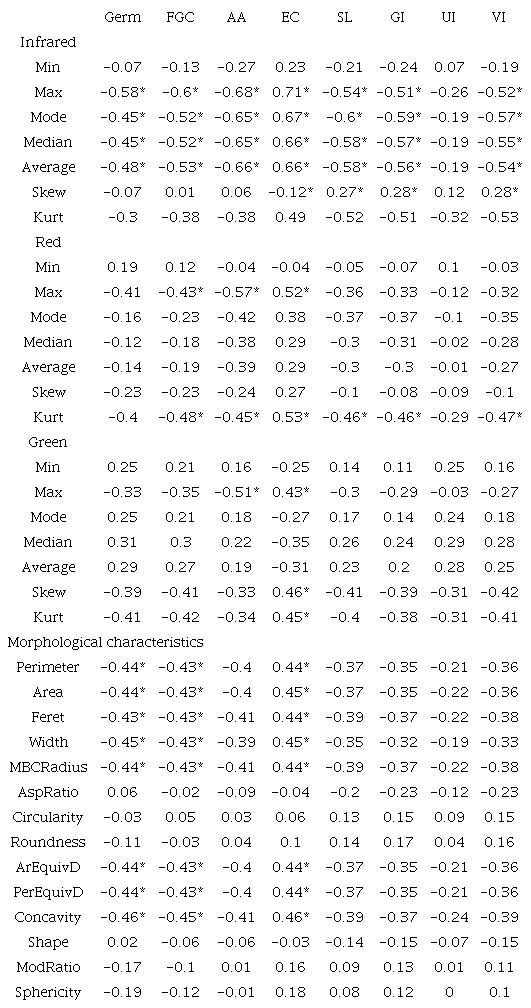 The correlations among physiological, multispectral, and morphological variables, i.e., among the 43 variables obtained for the seed lots evaluated, are shown in Table 2. In general, the variables indicating seed physiological potential (except seedling uniformity) had negative and significant correlations with most of the variables obtained from the infrared spectrum. Some morphometric variables related to seed size also had significant and inverse correlations with germination, first germination count, and electrical conductivity.