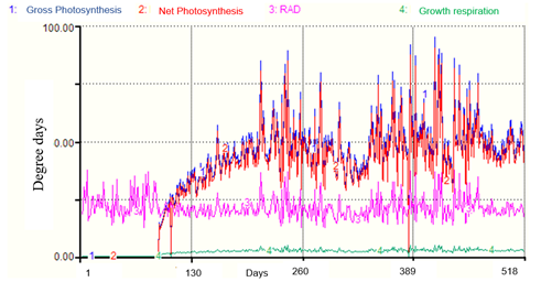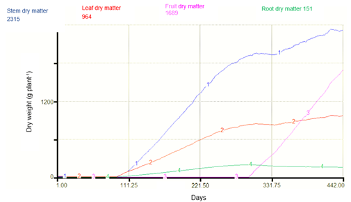 Interconnections with the other submodels is demonstrated by the graph generated in Figure 10, which characterizes the growth of each part of the plant throughout the first cycle.