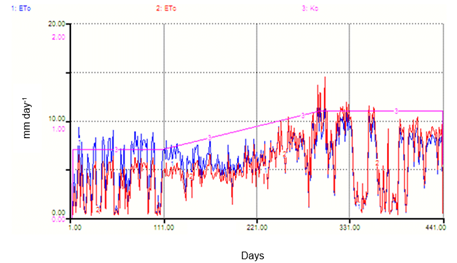 The higher the frequency of irrigation, the higher the initial Kc (Bernardo, Soares, & Mantovani, 2008), considering that frequency of irrigation depends on the evapotranspiration demanded and the soil moisture of the site. Based on the values defined for Kc, the respective ETc values were obtained, as shown next to the reference evapotranspiration (ET0) in Figure 2.