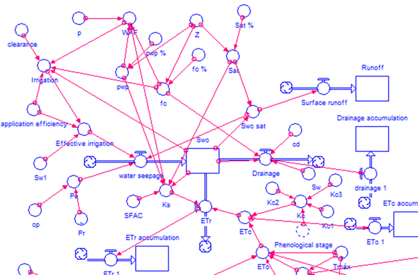 The soil water balance submodel is represented by a flowchart, also called the Forrester diagram (Forrester, 1992). It describes the schematization of the model by levels and flows, as presented in Figure 3.