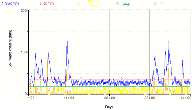 The simulated soil is characterized as sandy, with the values of field capacity and permanent wilting point corresponding to 8.72% and 2.37% of humidity, respectively. The effective depth of the root system was assumed to be 30 cm. These values were based on a study by Figueiredo (2006). Thus, the water availability factor (WAF) of soil water (mm) was determined. As shown in Figure 4, the value of the blade to be irrigated was calculated to prevent water deficit and maintain the plants in water availability factor (WAF) of soil water (mm).