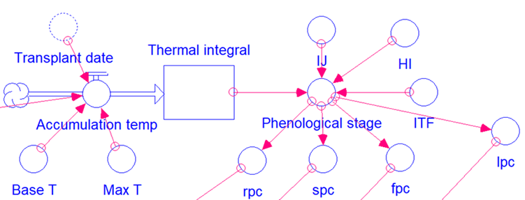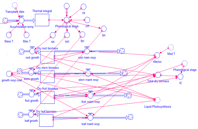 From the net photosynthesis, it was possible to determine the dry matter for the plant organs, as shown in Figure 9, using the Forrester diagram (Forrester, 1992). This was built on the dry matter production submodel of the plant, resulting in the values described in Table 2.