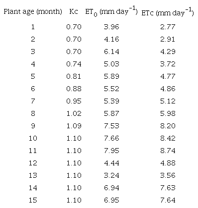 In the hottest months of the year in the region (August, September, and October), the highest evapotranspiration values were observed. The evapotranspiration of the crop was highest in October, which is the eleventh month of the plant age, as shown in Table 1. This response is due to the climatic conditions of the region because October is characterized as the driest month.