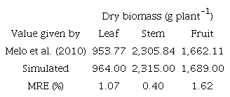 The simulated dry matter values were compared with those observed in the field by Melo et al. (2010), who studied in detail the growth and development of the organs of the cultivar Prata-Anã, conducted under similar experimental conditions. However, Melo et al. (2010) considered the effects of nutrients on plant growth.