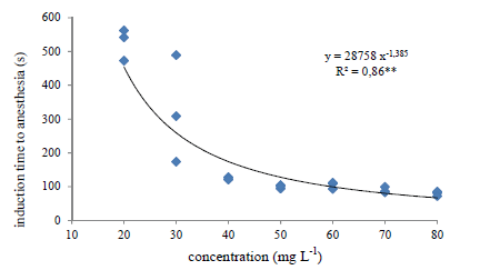 The equation developed to predict time for anesthesia induction in juvenile matrinxãs with 20 to 80 mg L-1 of EO was Y = 28758 c -1.385 (R2 = 0.86; F = 428.641), where Y is induction time to anesthesia in seconds, and c is EO concentration in mg L-1. In general, a fish anesthetic should provide anesthesia in less than 3 min., (Marking & Meyer, 2011). In this work fish weight (g) and length (cm) were easily measured in the anesthetized fish. After they were returned to anesthetic-free clean water, fish recovered from anesthesia in less than 2 min. as suggested Marking and Meyer (2011), and time to equilibrium reestablishment was similar for all treatments. Fish restarted feeding nearly 6h after the experiment. No fish mortality was observed even one month after the tests.