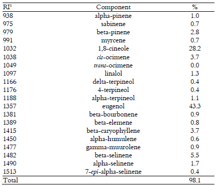 The major components were eugenol, 1.8 cineole and beta-selinene (Table 1). Eugenol content was lower than observed by Silva et al. (2012). This may change according to plant specific genetic characteristics and local conditions. Usually when the major component decrease minors increase. In general, there is no uniform essential oil composition. This may change when oil is extract from different parts of the same plant, farming practices, and extraction method. Difference in the compositon is known as the oil components are plant metabolism products so variable according plants life cicle. Some components transformations to anothers may take place, and even after oil extraction. Reactions among the different oil components may occur as interactions among oil and environmental factors (light, enzymes and the container) are dynamics (Luz, Ehlert, & Innecco, 2009).