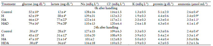 Plasma sodium and chloride had no statistical differences (Table 3). At T0, matrinxãs submitted to HDA exhibited the highest levels of plasma glucose (F = 14.007) and ammonia (F = 9.353) (Table 3).