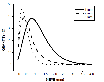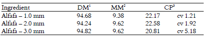 Figure 1 shows size particles of each grinding. All treatments provided particle size less than expected. Most sieves and knives adjusted to 3.0 mm had particle sizes ranging between 0.5 and 1.5 mm, with significant dispersion when compared to 1.0 and 2.0 mm grinding. Greater homogeneity in particle size was better for the two treatments. Greater preciseness should be expected for laboratory analyses, as Table 1 shows, where CP rates were more exact with more intense grinding, also reported by Casali et al. (2008). These authors added that grinding with 2.0-mm-pore sieve may be suggested for the standardization of samples in in situ analyses (NRC, 2001).