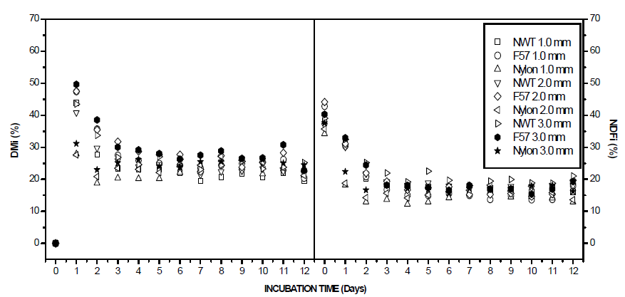 Similarity in iDM and iNDF rates at the last period of incubation suggests that differences in initial times for nylon may be related to high rates of ruminal degradation of alfafa plus a greater fluidity of the material when compared with F57 and TNT. In fact, they provide a slower rate in bacterial activity in the degradation of NDF as they limit the exit of degraded material. Undesired materials after the incubation process may be eliminated in the fiber extraction process, with inconsistent rates.