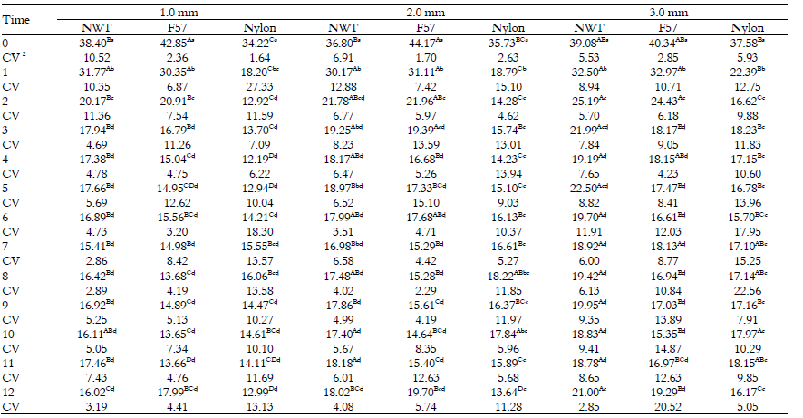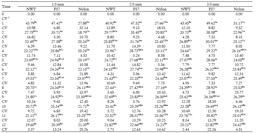 1Rates of indigestible dry matter in alfafa in three grindings, materials and incubation times (%); 2CV = Coefficient of Variation (%). Capital letters denote significant differences among materials of each grinding; small letters denote significant differences between incubation times; means are compared by tukey’s test (p < 0.05).At zero time, direct extraction in neutral detergent solution in Ankon® fiber analyzer, nylon textile in 1.0 and 2.0 mm grindings overestimated NDF rates (Table 3) where, according to Huhtanen Kaustell, and Jaakkola (1994), the exactness of results and possible loss of particle are compromised, as reported by Casali et al. (2009). Results in current assay corroborate these theories where, despite less intense grindings in treatments with 3.0 mm particles, also demonstrated particles lower than 0.5 mm (Figure 1) which, besides triggering the loss of particles, also affects the instability of results. Although textile integrity was not evaluated, Valente et al. (2011) report the decrease of resistance to NWT and Nylon tension when compared to F57, after the determination of iDM and iNDF where the possible influence of results in reuse is related.