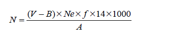 N is the nitrogen content (g kg-1), V is the volume of hydrochloric acid solution in the titration (mL), B is the volume of hydrochloric acid solution obtained in the titration of the blanks (mL), Ne is the expected normality of hydrochloric acid solution (0.02 or 0.05 N), f is the correction factor of the hydrochloric acid normality obtained by using sodium carbonate solutions, and A is the aliquot weight (mg).