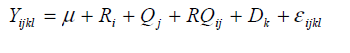 Yijkl is the nitrogen recovery in the aliquot l, at day k, using salt-to-metal catalyst ratio i, and amount of digestion mixture j; μ is the general constant; Ri is the effect of salt-to-metal catalyst ratio in the digestion mixture i (fixed effect); Qj is the effect of digestion mixture amount j (fixed effect); RQij is the interaction between the main effects (fixed effect); Dk is the effect of the day of analysis k (random effect); and εijkl is the random error.