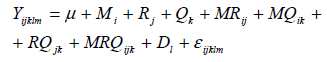 Yijklm is nitrogen content or digestion time in the aliquot m, at day l, from sample i, using salt-tometal catalyst ratio j, and digestion mixture amount k; μ is the general constant; Mi is the sample effect i (fixed effect); Rj is the effect of salt-to-metal catalyst ratio in the digestion mixture j (fixed effect); Qk is the effect of digestion mixture amount k (fixed effect); MRij, MQik, RQjk and MRQijk are the interactions between the main effects (fixed effects); Dl is the effect of the day of analysis (random effect); and εijklm is the random error.