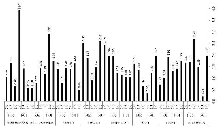 The repeatabilities obtained for both types of materials according to the different salt-to-metal catalyst ratios and amount of digestion mixture were considered low and adequate, and there was no specific pattern among the factors studied. The values ranged from 0.21 to 2.69% for low-nitrogen materials and from 0.49 to 3.94% for high-nitrogen materials (Figure 1).