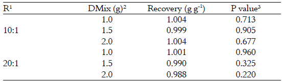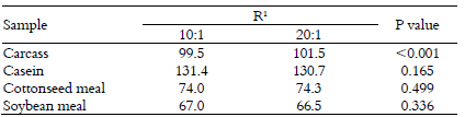 There were no effects (p > 0.05) of the amounts of digestion mixture or ratios of salt-to-metal catalyst on the nitrogen recovery from Lysine-HCl, and all recovery estimates were found to be equal to 1 (p > 0.05; Table 1). This indicates that different salt-to-metal catalyst ratios and digestion mixture amounts have the potential to provide complete recovery of nitrogen in the other samples.
