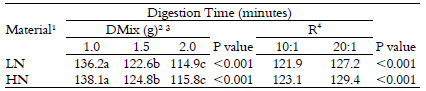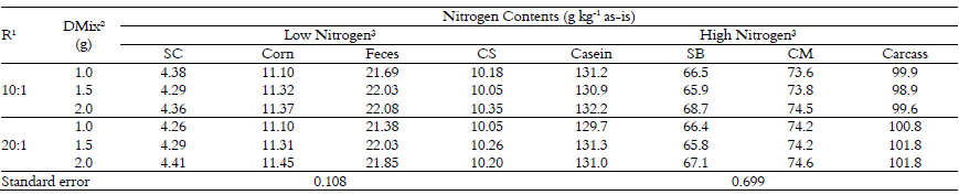 The average nitrogen contents in the low- and high-nitrogen samples are presented in Table 2. There was no effect (p > 0.05) of salt-to-metal catalyst ratio on low-nitrogen materials. However, there was an interaction (p < 0.01) between low-nitrogen material and amount of digestion mixture (Table 3). The evaluation of this effect indicated that only the nitrogen content in feces and corn samples were affected (p < 0.01) by the digestion mixture amount. For both materials, nitrogen contents were greater (p < 0.05) with use of 1.5 and 2.0 g of digestion mixture compared with 1.0 g (Table 4).