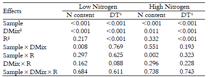 Descriptive levels of probability for type I error for the different fixed effects evaluated in low- and high-nitrogen content materials.