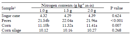This interaction seems to reflect differences in the structure and composition of the nitrogen compounds of each material. Corn protein is mainly composed of prolamines, particularly zein, which consists of a helical structure rich in glutamine, leucine, and proline, with a high index of crosslinking and hydrophobic interactions (Argos, Pedersen, Marks & Larkins, 1982; Keith & Bell, 1988). On the other hand, the nitrogen compounds from the ruminant feces are formed by indigestible microbial material, endogenous substances (e.g. keratinized tissue), and nitrogen associated with Maillard products or lignin, with low evidence of the presence of potentially digestible protein from the feed (Van Soest, 1994). Therefore, these two particular materials appear to demand a more complex process of digestion, mainly by the action of the metal catalyst. Thus, decreasing the amount of digestion mixture may have impaired nitrogen mineralization. It is noteworthy that prolamins are in lower concentrations in corn silage compared with corn grain, justifying the lack of effect of the amount of digestion mixture in the corn forage.