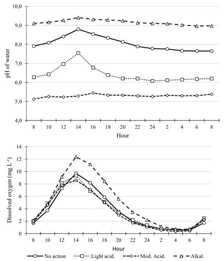 Over the diel monitoring, the pH of water remained almost constant in the moderately acidified and alkalinized tanks (5.3 ± 0.1 and 9.2 ± 0.1, respectively). On the other hand, there was an expressive increase in water pH in the slightly acidified tanks at 1400 (Figure 1). The diel pattern for the water pH in the slightly acidified tanks has resembled that verified in the control tanks. That suggests that out of the three treatments, i.e., slight acidification, moderate acidification and alkalinization, the first was the one that minimally affected the phytoplankton dynamics in the tanks.