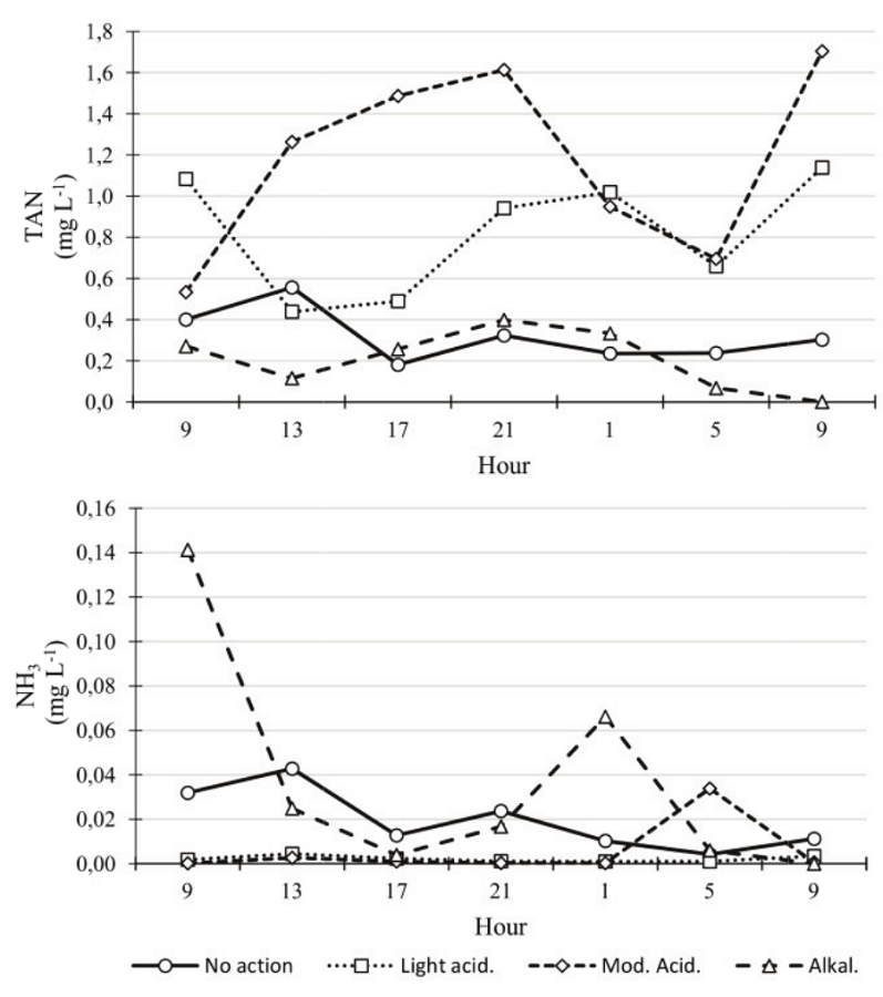 The concentrations of TAN remained low in the control and alkalinized tanks throughout the diel monitoring. On the contrary, the levels of TAN in water were higher in the acidified tanks, especially in the moderately acidified, than in the other tanks, except for the alkalinized tanks. In the latter tanks, NH3 concentrations as high as 0.14 mg L-1 were observed over the diel monitoring (Figure 2).