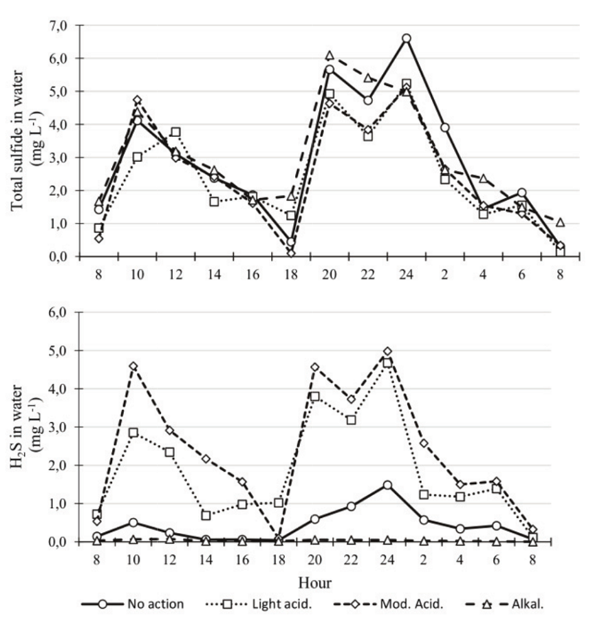 Variations in total sulfide levels were very similar between the treatments along the diel monitoring. The total sulfide concentrations increased from 1.13 ± 0.52 mg L-1 at 0800 to 4.07 ± 0.75 mg L-1 at 1000 and decreased afterwards up to 0.91 ± 0.78 mg L-1 at 1800. Next, there was a pronounced increase up to 5.49 ± 0.75 mg L-1 at 2400 (midnight), when concentrations as high as 7.9 mg L-1 were determined. Then, the total sulfide concentrations fell again up to 0.46 ± 0.40 at 0800, when no sulfide was detected in some tanks (Figure 3). For the acidified tanks (slight and moderate), the concentrations of H2S in water have matched the concentrations of total sulfide over the diel monitoring, since the proportion of H2S in total sulfide increases as the pH of water drops (Boyd et al., 2016). On the other hand, lower concentrations of H2S were registered in the control tanks (0.42 ± 0.42 mg L-1) and almost no H2S (0.03 ± 0.02 mg L-1) was detected in the alkalinized ones (Figure 3).