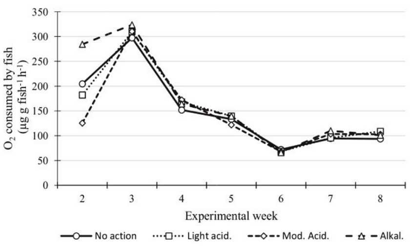 Except for the second experimental week, when fish in the alkalinized tanks consumed more DO than fish stocked in moderately acidified water (284.4 and 125.5 µg DO g fish-1 h-1, respectively), the consumption rates of DO by fish allotted to the respirometers were very similar between the treatments and control group (non-action) over time (Figure 4).