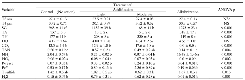 The specific conductance (SC) of water increased with the acidification and, mainly, alkalinization of water. The ionic concentration or salinity of water is the main factor responsible for the water SC. However, once the isosmotic point for Nile tilapia is near 12 g L-1 (Hassan et al., 2013) and the highest TDS (total dissolved solids) of water in the present work was 870 gm L-1, these minor variations in SC of water have probably not affected the tilapia physiology.