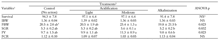 A minimum TA of 20 mg L-1 CaCO3 eq. is required for an acceptable water pH buffering in aquaculture tanks (Boyd et al., 2016). In the present work, however, since the pH of water was deliberately controlled to reach certain levels, the effect of low TA on water pH was null. While the acidification of water has increased the total hardness (TH), the alkalinization has reduced it (Table 1). The highest TH of 223.4 mg L-1 CaCO3 was found in one of the moderately acidified tanks; the lowest TH of 102.7 mg L-1 CaCO3 was found in one of the tanks subjected to alkalinization. Boyd et al. (2016) recommended TH between 40 - 300 mg L-1 CaCO3 for aquaculture production. Therefore, the values of TH for both the acidified and alkaline tanks have remained within the appropriate range.