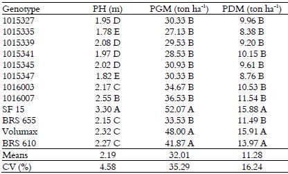Data on plant height (PH), green matter production (PGM) and dry matter production (PDM) were significantly different between genotypes evaluated (p < 0.05) (Table 1).